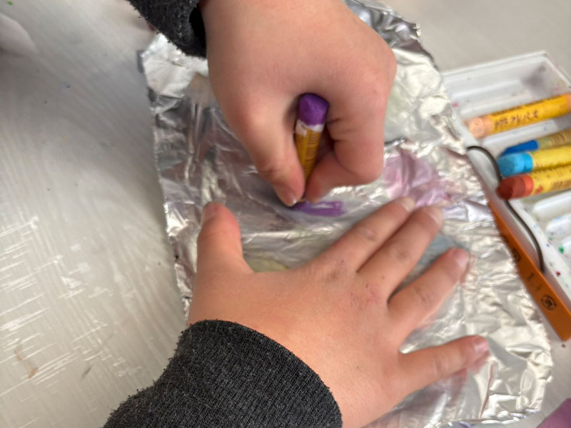 ・アルミホイルにクレヨンで好きな色を塗る